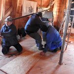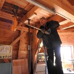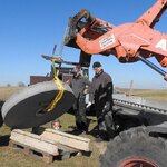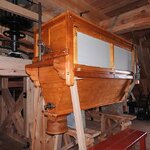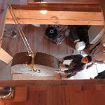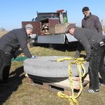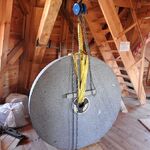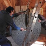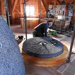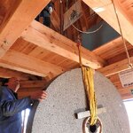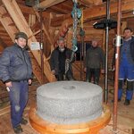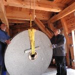 Am 19.03.2018 wurden die beiden Steine für den Mahlgang unserer Mühle angeliefert. Zwei Mitarbeiter des Mühlenbaubetriebes Blümner haben die Steine vom 19. bis 21. März in der Mühle montiert. Dabei konnten sie auf die tatkräftige Mithilfe der Vereinsmitglieder Christian Koch, Gerolf Rother, Ingo Waligora und Jörg Berkner bauen. Ganz besonders wichtig war die Hilfe von Bauunternehmer Fred Günther, der mit seinem Radlader die beiden Mahlsteine vom Transporter hob und geschickt in die Eingangstür bugsierte. Von Hand wäre da nichts zu machen gewesen, denn die Steine haben ihr Gewicht. Zuerst wurde der Bodenstein entladen, dann aufgerichtet, in der Tür abgesetzt, ein paar Schritte gerollt und schließlich mit einem Kettenzug in die erste Etage, also auf den Steinboden der Mühle gehoben - eine kräftezehrende Arbeit. Nachdem der Bodenstein an der richtigen Stelle lag, wurde der Läuferstein auf dem gleichen Weg nach oben geschafft. Da der Läuferstein deutlich dicker und somit schwerer ist, wurde er zur Sicherheit mit zwei Kettenzügen zugleich angehoben. Das Absetzen des Läufersteins auf den Bodenstein war nochmal eine richtige Herausforderung, denn der Stein durfte dabei nicht an das Mühleisen anschlagen, also an die senkrechte Welle, die aus dem Bodenstein hervorsteht. Am Ende des zweiten Tages war diese Arbeit geschafft. An den folgenden Tagen wurden der Sichter im Erdgeschoss an die richtige Position gebracht und der Steinkran auf dem Steinboden vorgerichtet. Zur endgültigen Montage von beiden müssen erst noch einige Teile angefertigt werden.