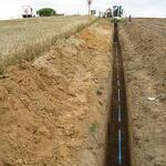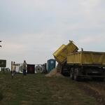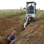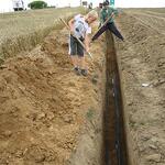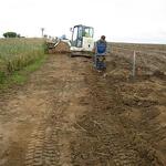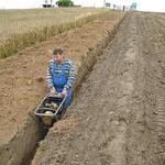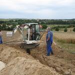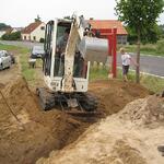 Das Wochenende war trotz wechselhaftem Wetter und kleiner technischer Schwierigkeiten sehr erfolgreich. Unter fachmännischer Anleitung von Christian Koch und Hilfe von Vorsitzendem Horst Fichtmüller sowie Vereinsmitglied Uwe Lorenz wurde von den MAE-Kräften Waligora, Knieps und Hackbarth sowie dem 2. Baggerfahrer B.Magnus der Graben von der Straße bis zum Mühlenhügel gezogen, um Wasser- und Elektrokabel zu verlegen. Auf den Bildern ist der Arbeitsablauf vom Aufbruch angefangen über das Verlegen bis hin zum Schließen und Einebnen des Kabelgrabens gut zu sehen. Dabei wurden Reste des zu DDR-Zeiten größtenteils abgetragenen historischen Mühlenwegs gefunden.