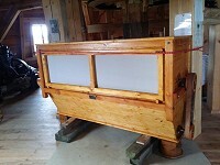 Heute wurden der Sechs-Kant-Sichter zum Sieben des Mahlgutes und die äußere Hülle des Mahlgangs, die sogenannte Bütte, (beides von Mühlenbau Blümner) geliefert. Während der Sichter noch bis zur endgültigen Installation im Erdgeschoss verbleibt, haben unsere Müller Ingo Waligora und Gerolf Rother schon mal die Bütte an ihren Platz auf dem Steinboden (1. Stock) transportiert und den dazugehörigen Trichter aufgebaut.
