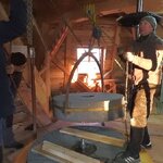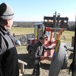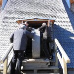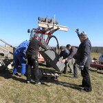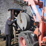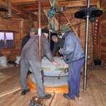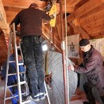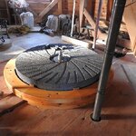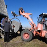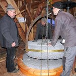 Am 19.03.2018 wurden die beiden Steine für den Mahlgang unserer Mühle angeliefert. Zwei Mitarbeiter des Mühlenbaubetriebes Blümner haben die Steine vom 19. bis 21. März in der Mühle montiert. Dabei konnten sie auf die tatkräftige Mithilfe der Vereinsmitglieder Christian Koch, Gerolf Rother, Ingo Waligora und Jörg Berkner bauen. Ganz besonders wichtig war die Hilfe von Bauunternehmer Fred Günther, der mit seinem Radlader die beiden Mahlsteine vom Transporter hob und geschickt in die Eingangstür bugsierte. Von Hand wäre da nichts zu machen gewesen, denn die Steine haben ihr Gewicht. Zuerst wurde der Bodenstein entladen, dann aufgerichtet, in der Tür abgesetzt, ein paar Schritte gerollt und schließlich mit einem Kettenzug in die erste Etage, also auf den Steinboden der Mühle gehoben - eine kräftezehrende Arbeit. Nachdem der Bodenstein an der richtigen Stelle lag, wurde der Läuferstein auf dem gleichen Weg nach oben geschafft. Da der Läuferstein deutlich dicker und somit schwerer ist, wurde er zur Sicherheit mit zwei Kettenzügen zugleich angehoben. Das Absetzen des Läufersteins auf den Bodenstein war nochmal eine richtige Herausforderung, denn der Stein durfte dabei nicht an das Mühleisen anschlagen, also an die senkrechte Welle, die aus dem Bodenstein hervorsteht. Am Ende des zweiten Tages war diese Arbeit geschafft. An den folgenden Tagen wurden der Sichter im Erdgeschoss an die richtige Position gebracht und der Steinkran auf dem Steinboden vorgerichtet. Zur endgültigen Montage von beiden müssen erst noch einige Teile angefertigt werden.