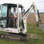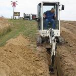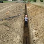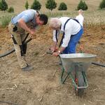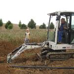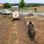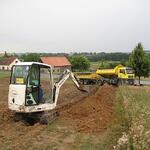 Das Wochenende war trotz wechselhaftem Wetter und kleiner technischer Schwierigkeiten sehr erfolgreich. Unter fachmännischer Anleitung von Christian Koch und Hilfe von Vorsitzendem Horst Fichtmüller sowie Vereinsmitglied Uwe Lorenz wurde von den MAE-Kräften Waligora, Knieps und Hackbarth sowie dem 2. Baggerfahrer B.Magnus der Graben von der Straße bis zum Mühlenhügel gezogen, um Wasser- und Elektrokabel zu verlegen. Auf den Bildern ist der Arbeitsablauf vom Aufbruch angefangen über das Verlegen bis hin zum Schließen und Einebnen des Kabelgrabens gut zu sehen. Dabei wurden Reste des zu DDR-Zeiten größtenteils abgetragenen historischen Mühlenwegs gefunden.
