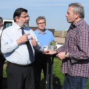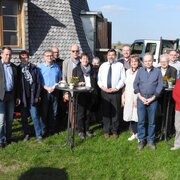 Eine Delegation des Landratsamtes aus unserem Partnerkreis Minden-Lübbecke besuchte die Greiffenberger Mühle und konnte dabei den Fortschritt der Bauarbeiten besichtigen. Landrat Dietmar Schulze und Vereinsvorsitzender Horst Fichtmüller begrüßten die Gäste bei sonnigem Frühlingswetter auf dem Mühlenberg. Die Gäste stellten viele Fragen zu Technik und Geschichte der Mühle und waren begeistert, wie weit der Wiederaufbau der Mühle inzwischen vorangeschritten ist. Landrat Dr. Ralf Niermann trug sich in das Gästebuch der Mühle ein: „Ein großes Kompliment für Ihr enormes Engagement, um Ihre Mühle in großartiger Lage wieder funktionsfähig zu machen.“ Der Landkreis Minden-Lübbecke wird nicht umsonst „Mühlenkreis“ genannt. Die durch den Landkreis führende Westfälische Mühlenstraße umfasst 43 restaurierte Mühlen! Für die Instandhaltung dieser Mühlen betreibt der Landkreis eigens einen Mühlenbauhof. Die Fachleute in Minden kennen natürlich die Mühlentechnik in- und auswendig. Da beim Wiederaufbau der Greiffenberger Mühle sehr viele technische Detailfragen zu lösen sind, entstand bei den Gesprächen die Idee, einen Besuch der Greiffenberger Mühlenfreunde in Minden zu organisieren.